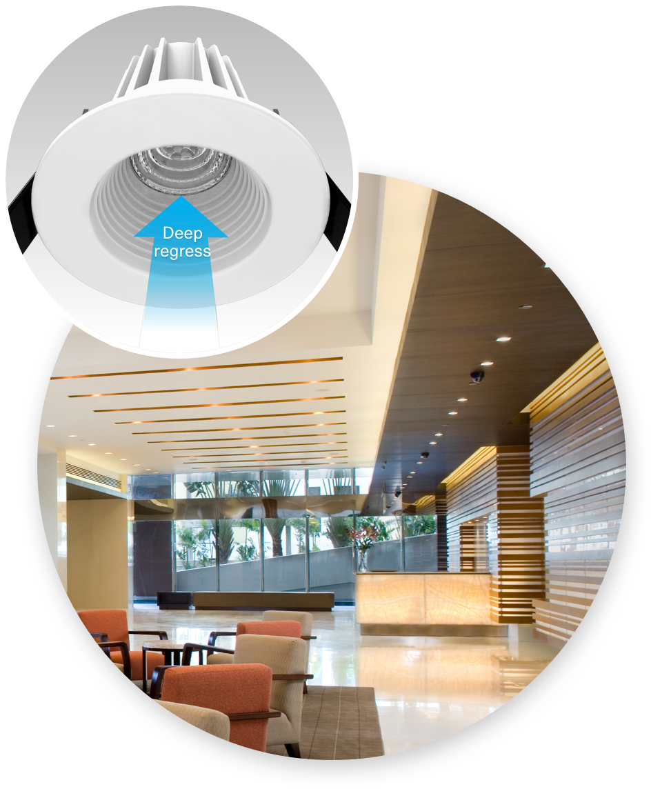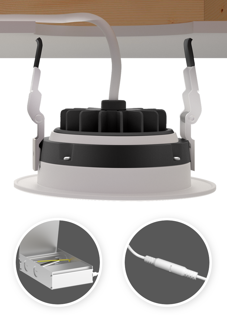 Installations are really flexible with an off-board driver that minimizes installation height, maximizes thermal management, and eliminates the need for a recessed housing. A plenum-rated cable connector links the downlight module to the remote driver, and then the module snaps into place with the adjustable, spring-loaded retention tabs. The super-thin design allows for these products to be installed inside shallow plenums.