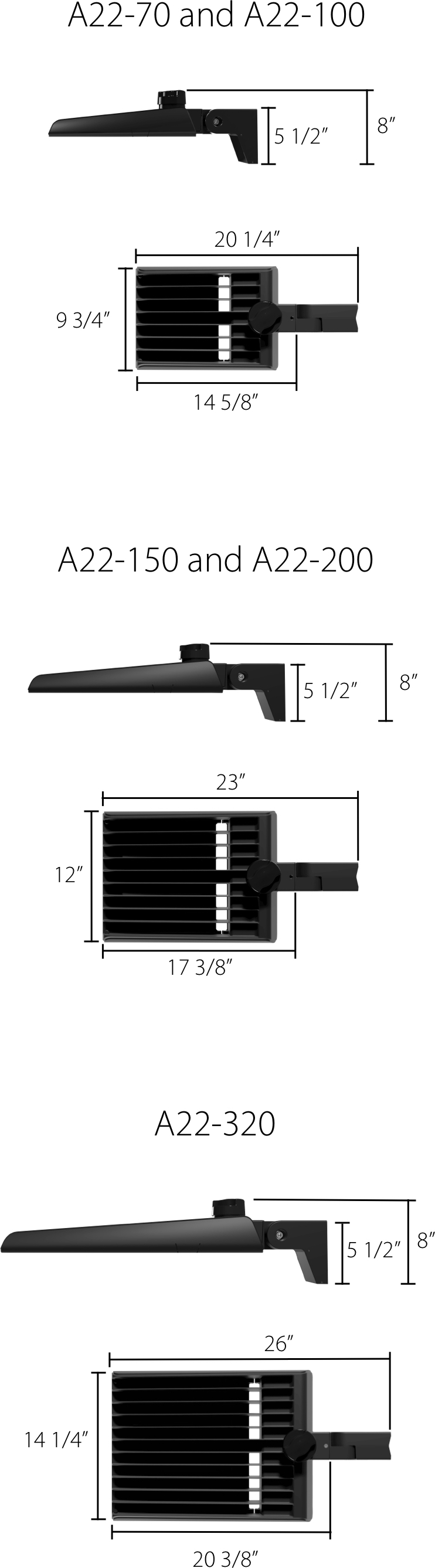 Available in a wide range of models—everything from 50W to 320W—the A22 comes with interchangeable optics that give you the flexibility to change output in the field. IES Type II, III, IV, and V distributions are all available.