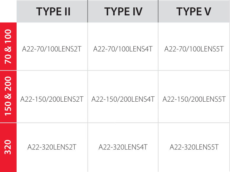 When you need one fixture to do it all, the A22-150X and 320X deliver. In addition to boasting three selectable wattages and color temperatures, and a twistlock photocell, the X models include three interchangeable lenses (Types III, IV, V) and an adjustable universal pole mount.