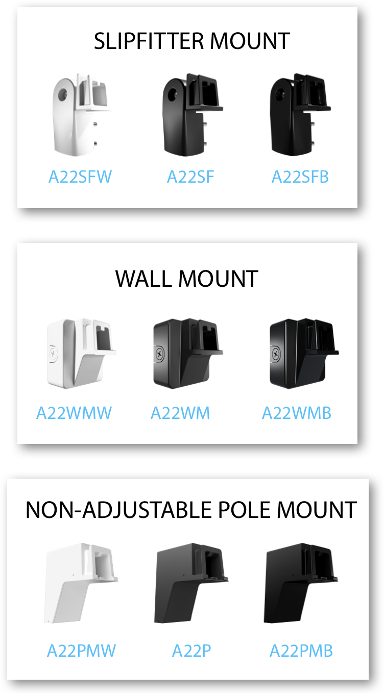 Out of the box, the A22 includes an adjustable, universal pole mount*, but several other mounting accessories are offered so that it can be used throughout various areas for one unified look.