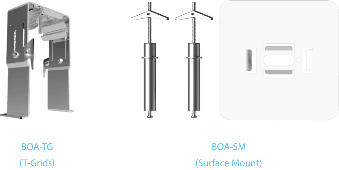 All pendant mount BOAs come standard with hardware that can accommodate dry wall, concrete, or T-bar mounting. Accessory kits are available for surface mounting (ceilings and/or walls) and recessed mounting into T-grids.