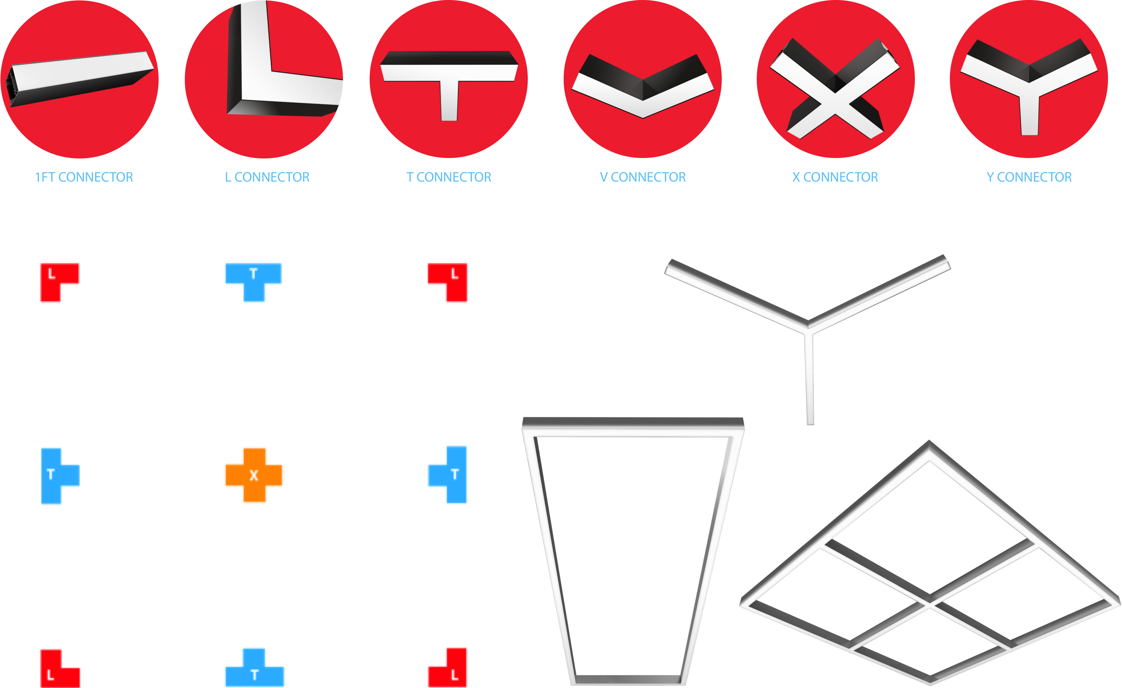 With the use of illuminated connectors, multiple lengths can easily be combined to create visually striking, intricate shapes. Connectors are available in all three colors and recessed models as well. We also offer an 82-foot roll of lens that can be cut to length on-site for a seamless look that eliminates light leakage. (See ordering options below)