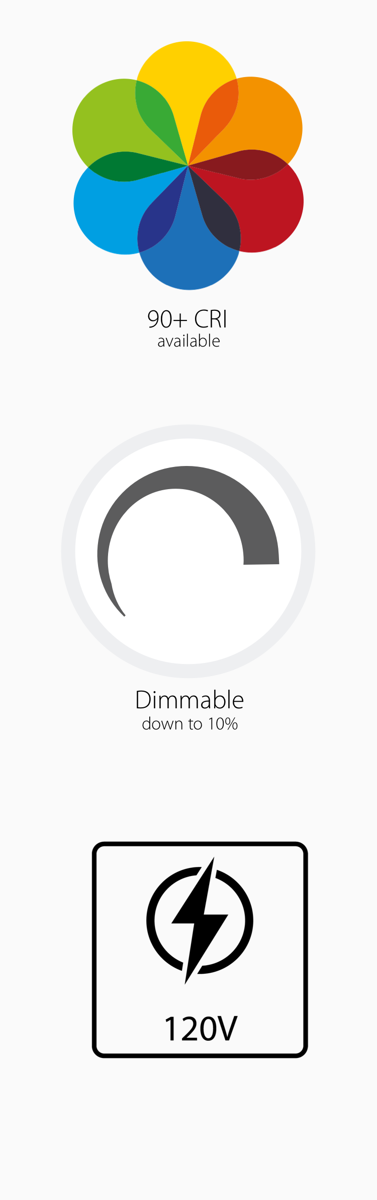 All models use a 120V driver with TRIAC dimming down to 10%. 90+ CRI comes standard for accurate color rendering.