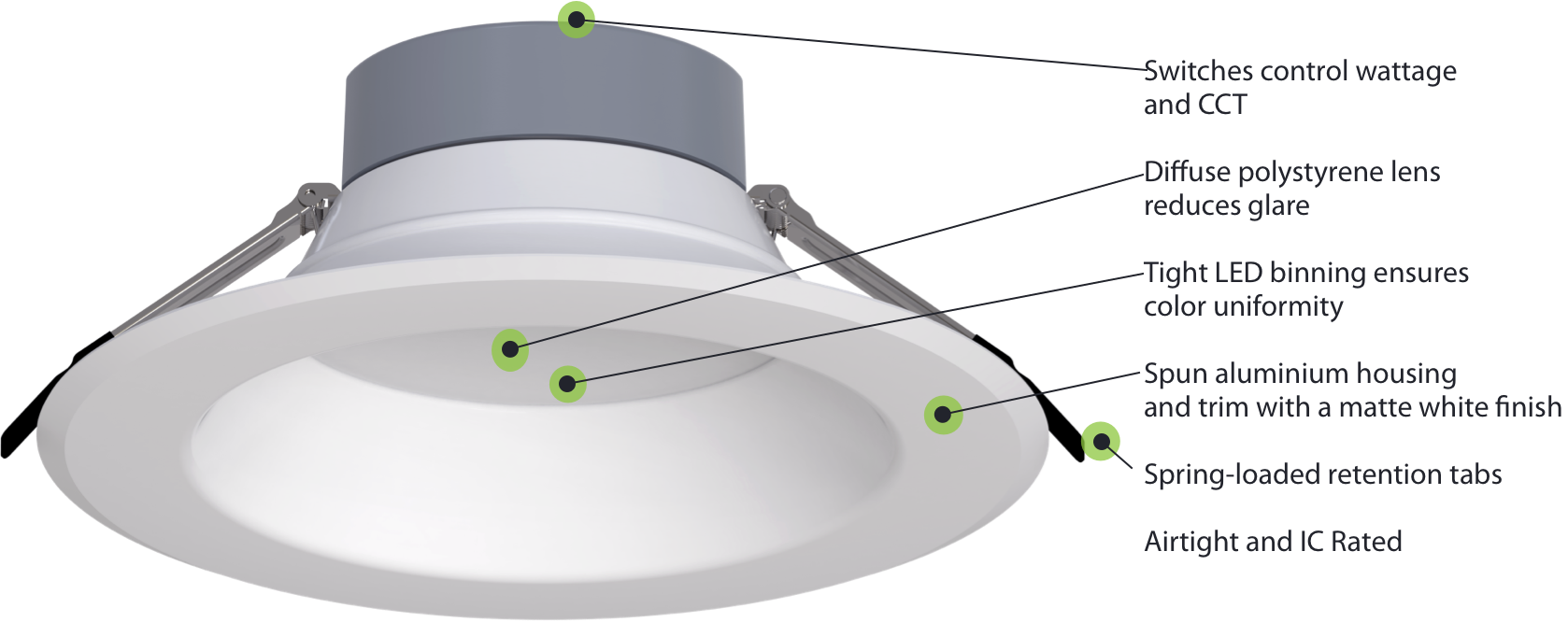 These field-adjustable, commercial downlights allow you to change both lumen output and color temperature with the flick of a switch, giving you the flexibility to customize various areas with one fixture! Available in 4", 6", 8", and 10" diameters, they're ideal for both new construction and retrofit applications.