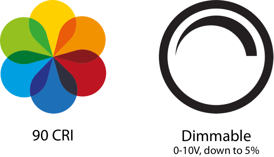 All models are dimmable to 5% (0-10V) and deliver 90 CRI for accurate color rendering.