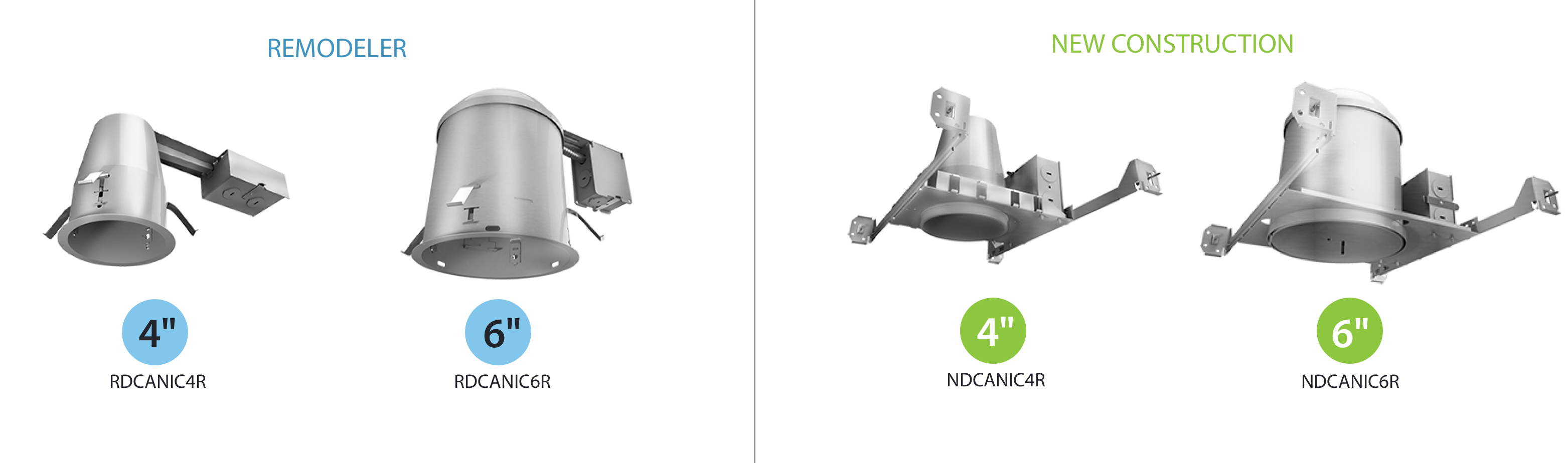 RAB carries 4” and 6” recessed housings in both new construction and remodeler models. All housings are IC rated for direct contact with insulation, and compatible with our retrofit downlights.
