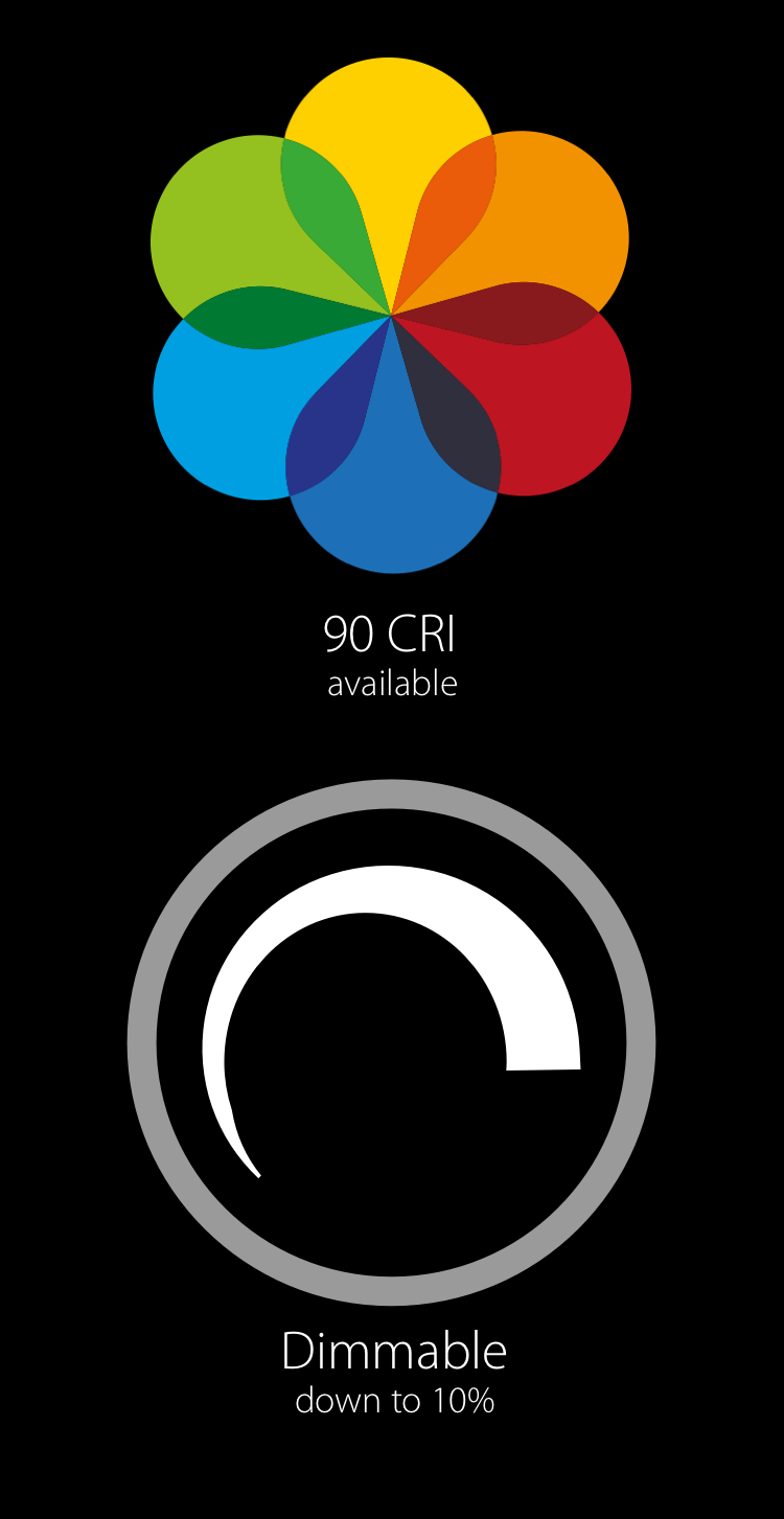 All wafers are dimmable—with most common TRIAC/ELV (120V) and 0-10V (120-277V)dimmers*. All models are Title 24 compliant. 90 CRI provides accurate color rendering, making them ideal for commercial applications where color is critical.