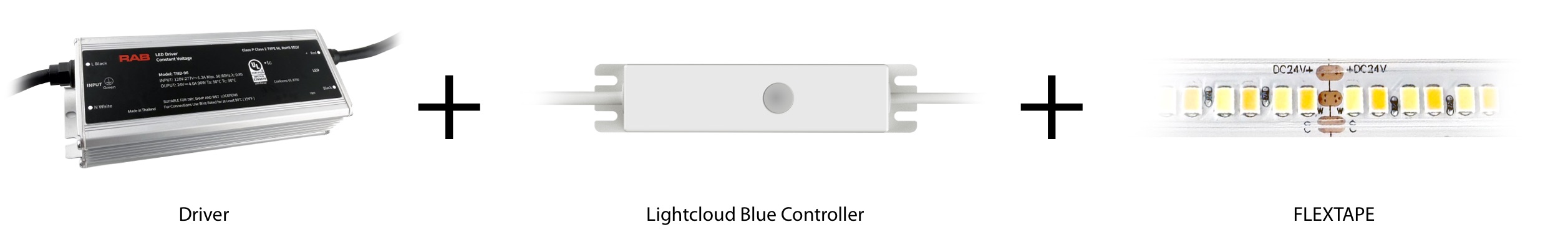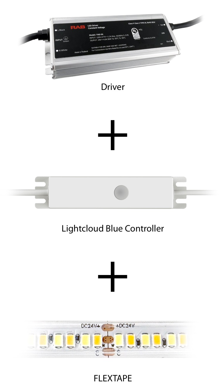 To create a smart, tunable white or RGB tape light system, three components are required: a driver (power supply), a Lightcloud Blue controller, and the compatible RGB or tunable white LED tape light. All three must be purchased and installed together to create a complete, smart system with wireless control, dimming, and color tuning.