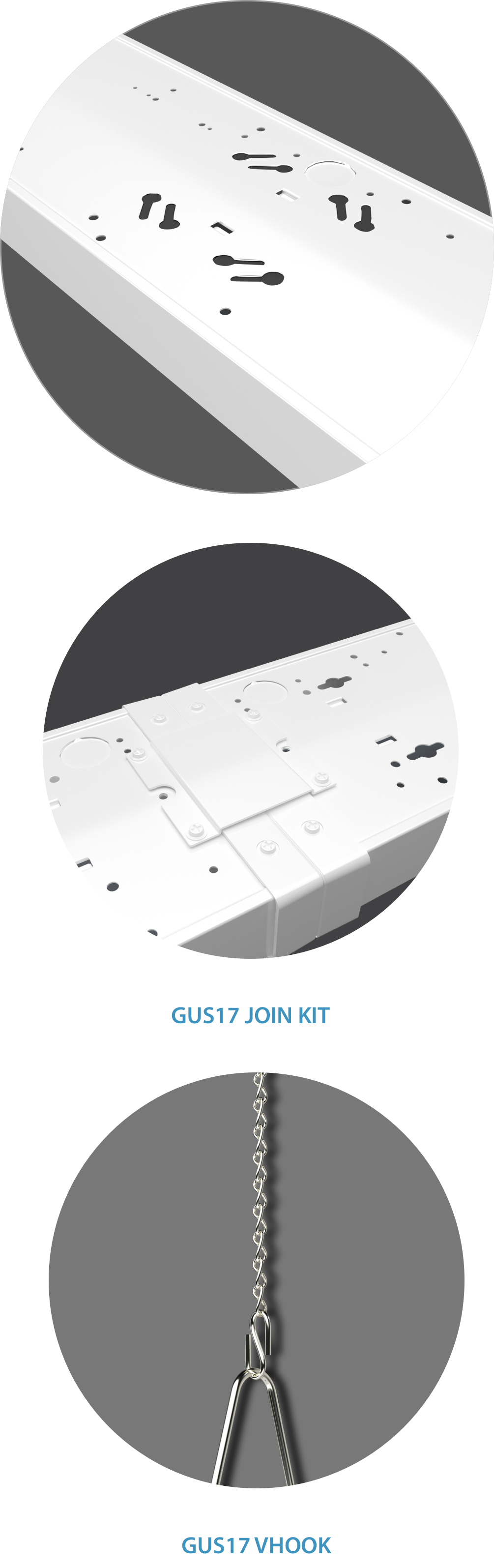 GUS17 can be surface mounted or mounted to a junction box. It can also be mounted in a variety of other ways. A V-hook mounting kit accessory is available for suspended mounting or, for continuous-run mounting, order the joiner bracket accessory.