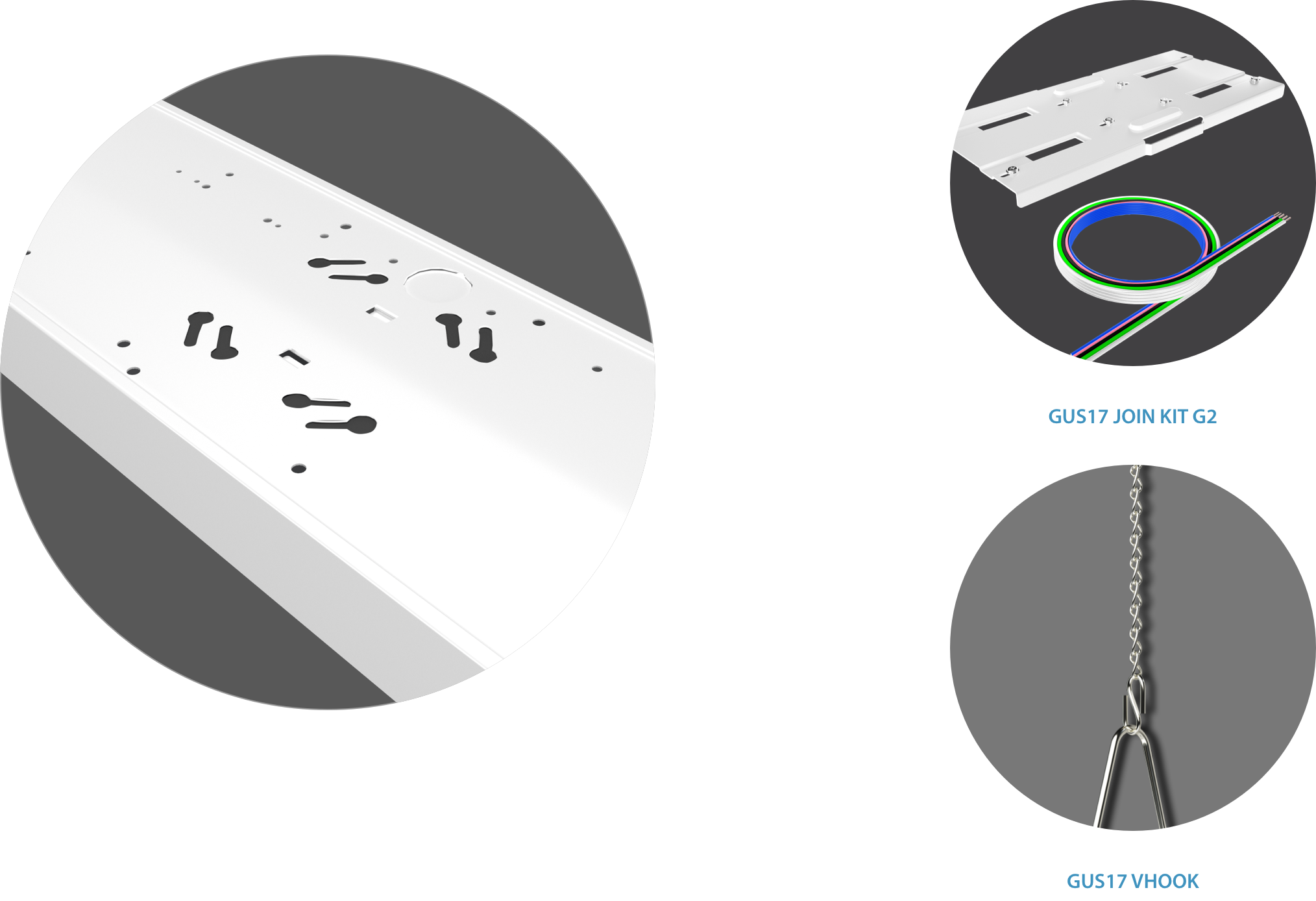 GUS17 can be surface mounted or mounted to a junction box. It can also be mounted in a variety of other ways. A V-hook mounting kit accessory is available for suspended mounting or, for continuous-run mounting, order the joiner bracket accessory.