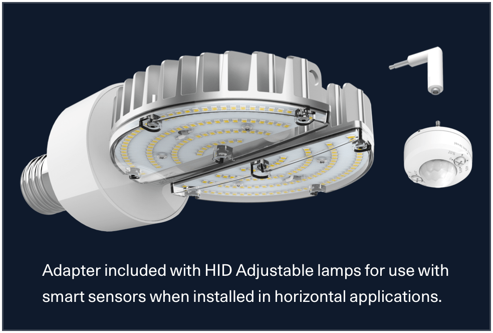The center stems have an AUX port for integrating individual, lamp-level sensor controls. RAB offers both MW (microwave) and PIR (passive infrared) sensors for use with these HID lamps. To help make sure that the sensor is aimed in the right direction, an adapter is available.