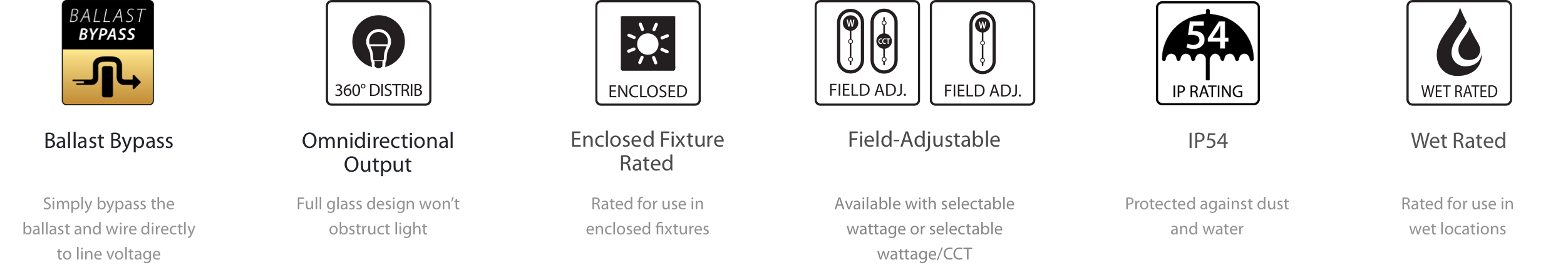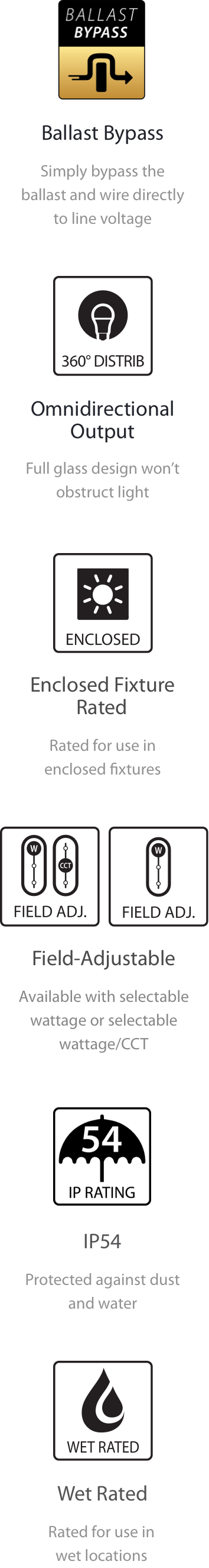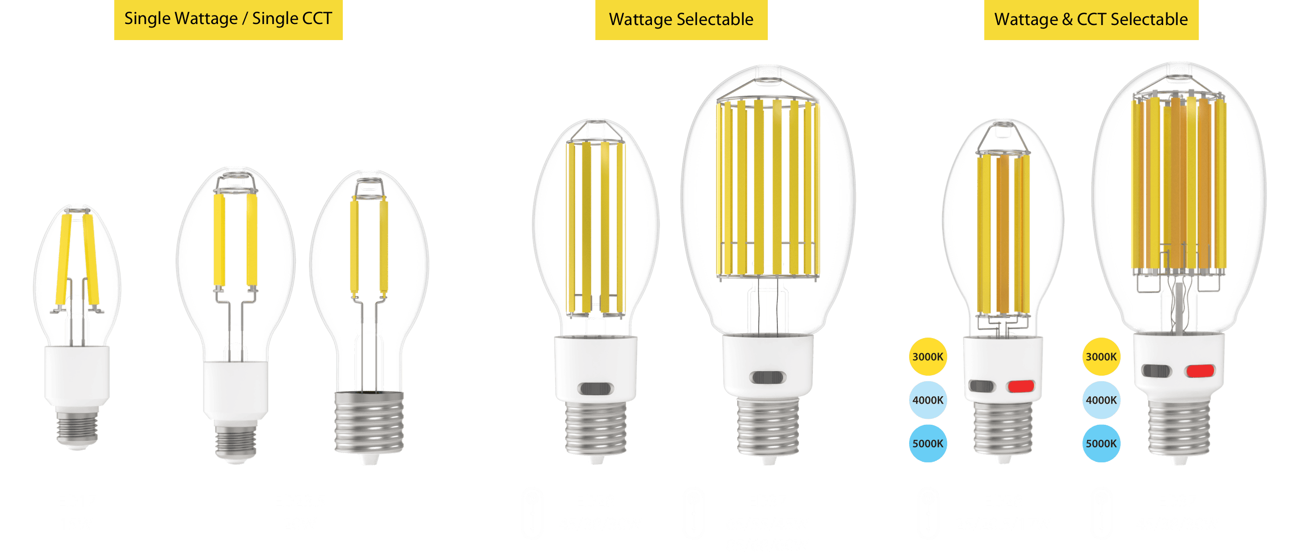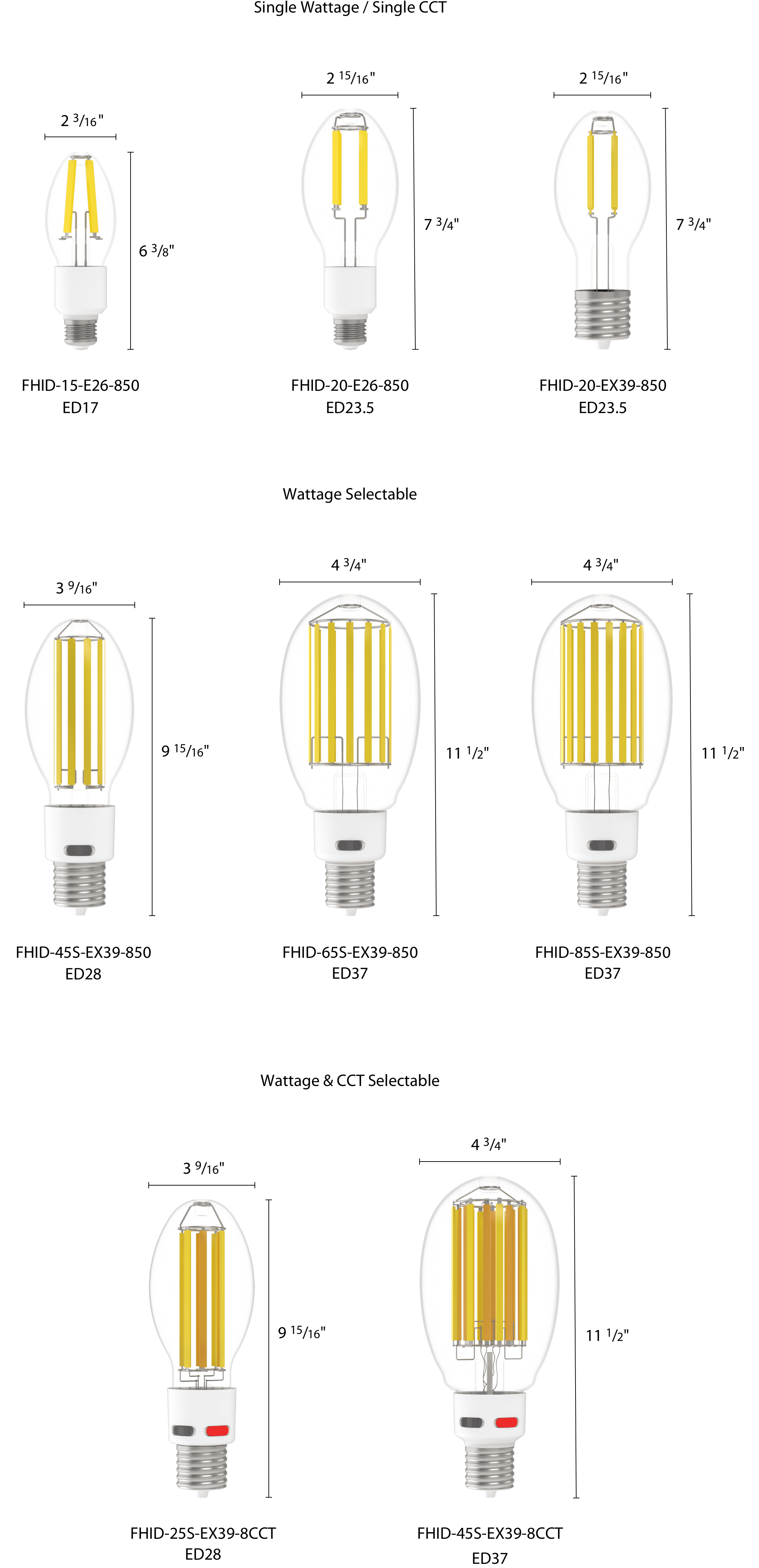 Designed to replace up to 500W MH , these filament lamps come in small and large forms, boast field adjustability, and are designed to match ANSI Standard lamp sizes: ED17, ED23.5, ED28, and ED37—all with true, 360° illumination.