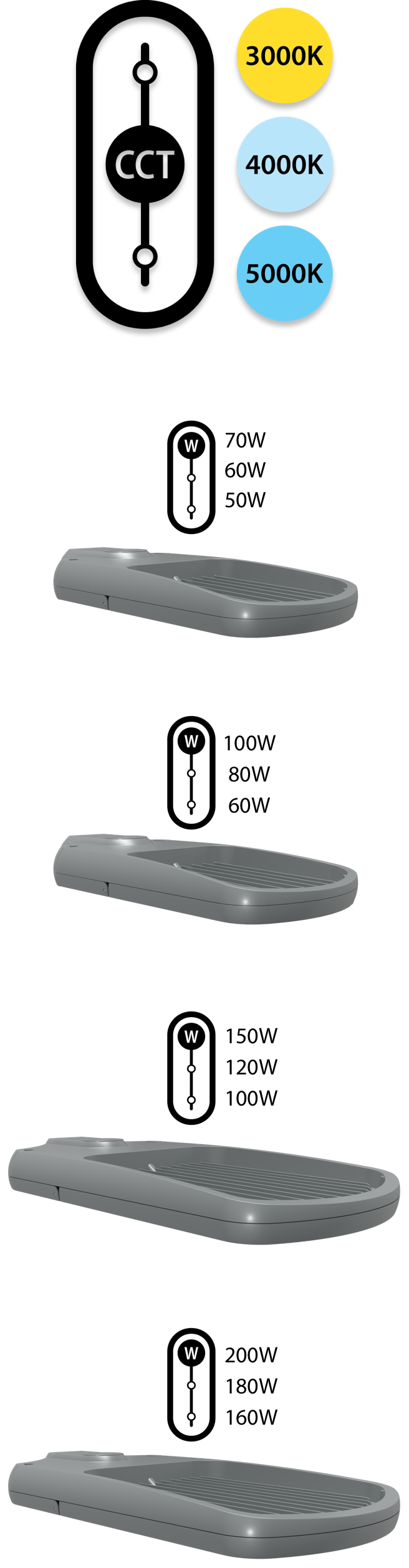 Available in two housing sizes, the KAI boasts fieldadjustable wattage and CCT settings that let you dial in the perfect light output for municipal, DOT, and streetlighting applications without stocking multiple SKUs. Switching distribution is as easy as flipping open the lens to swap out 2T, 3T, or 4T optics.