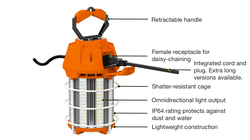 Offered with super-clear 5000K light, the TEMP’s omnidirectional output gives your work site 360° coverage. Each unit comes standard with a female receptacle for daisy chaining*, making it a breeze to get even, powerful lighting corner to corner.