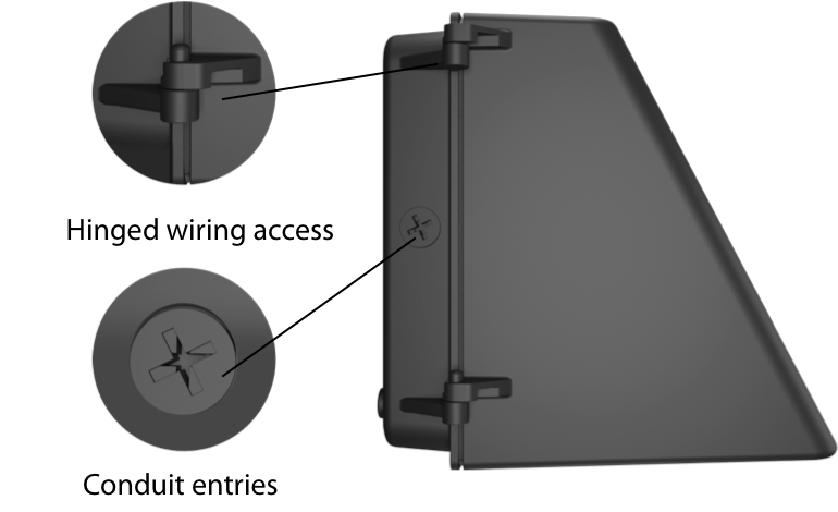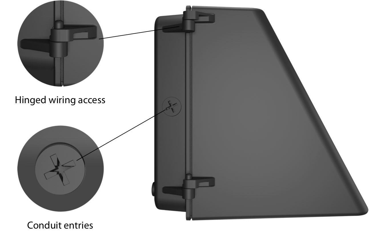 Hinged wiring access and conduit entries on the back, sides, top and bottom make installation a snap.
