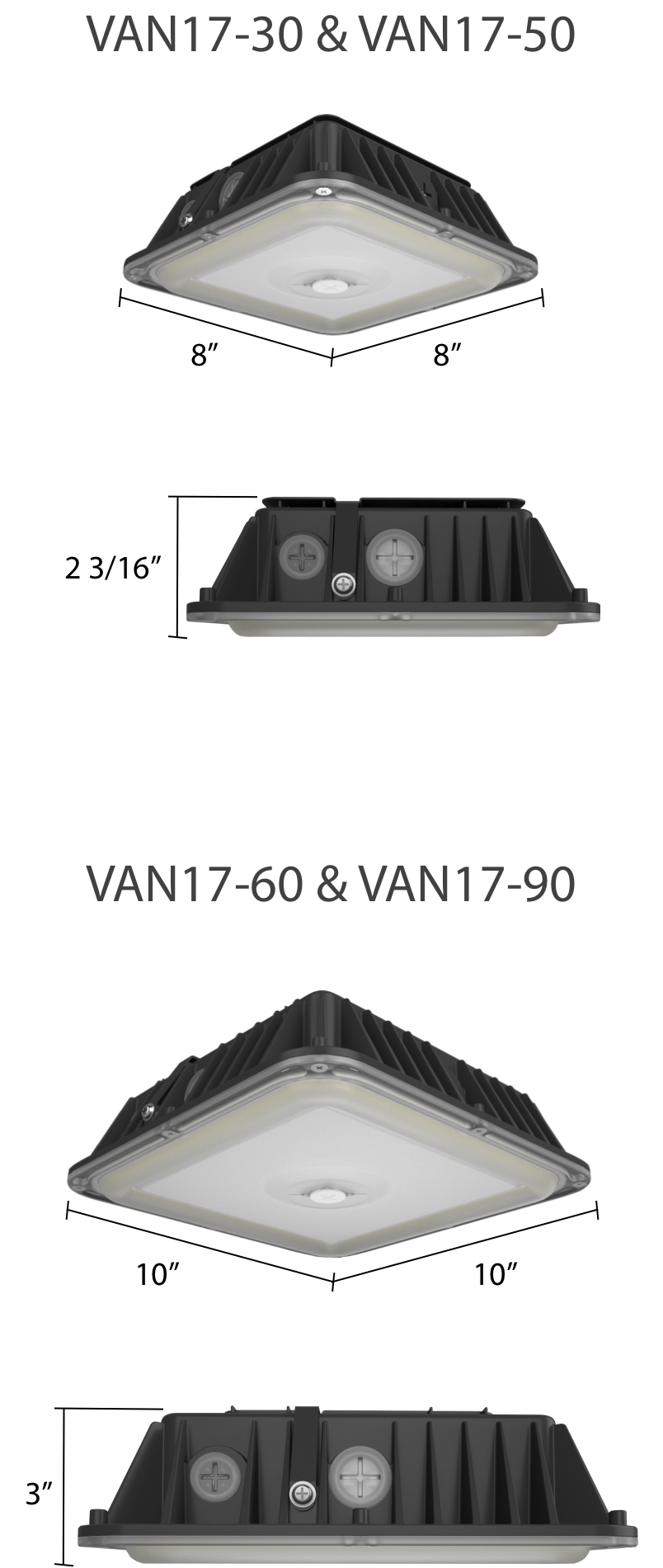 With adjustable wattage, adjustable CCT, and an on/off photocell, the VAN17 drastically reduces SKU count while maximizing flexibility in the field. Models are available in bronze and white, and in two sizes which cover the footprint of most old HID canopy lighting.