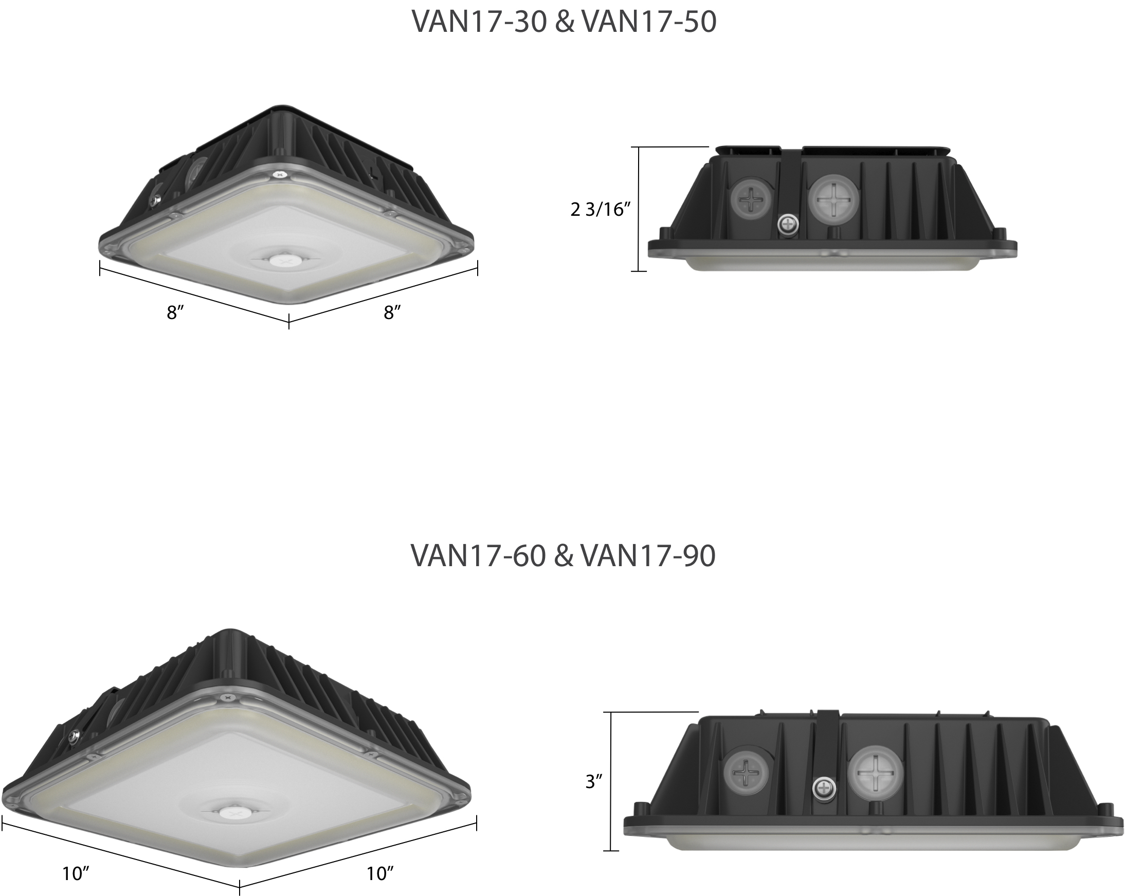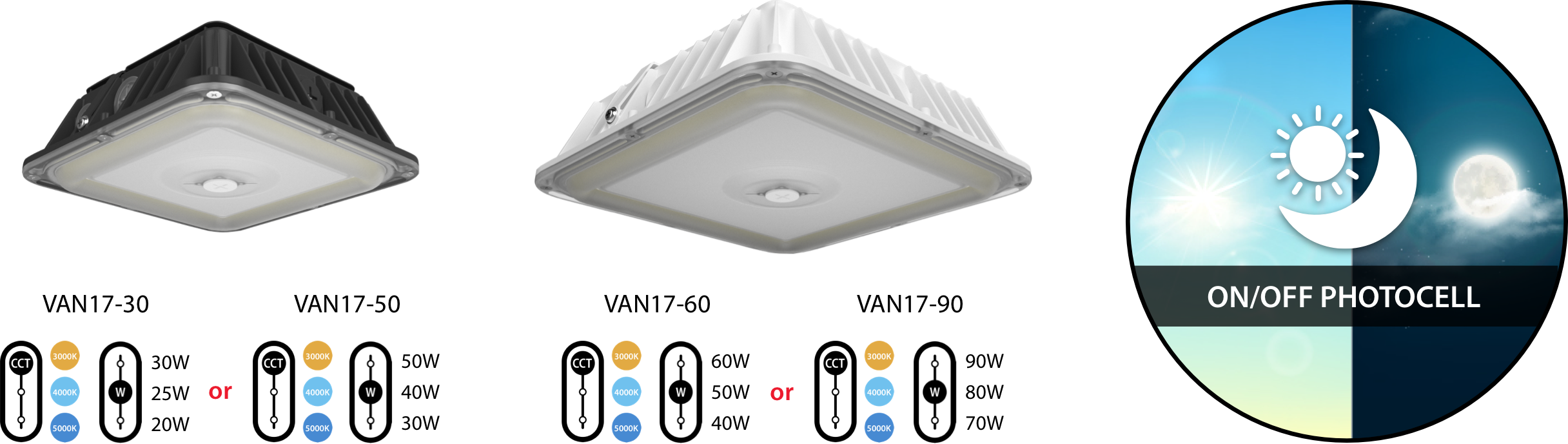 With adjustable wattage, adjustable CCT, and an on/off photocell, the VAN17 drastically reduces SKU count while maximizing flexibility in the field. Models are available in bronze and white, and in two sizes which cover the footprint of most old HID canopy lighting.