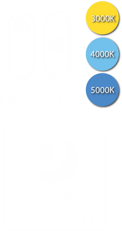 All sizes of these wall packs have 3-way field adjustability: 3 selectable wattages, 3 selectable color temperatures, and an on/off photocell, giving you 18 SKUs in one wall pack. This is a game changer in the world of ultra-economy fixtures!
