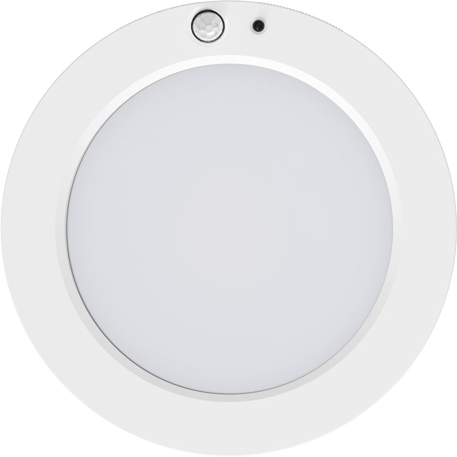 Contemporary round surface mount with integrated motion sensor and photocell. Adjustable dip switches for color temperature, motion modes, and hold times.
